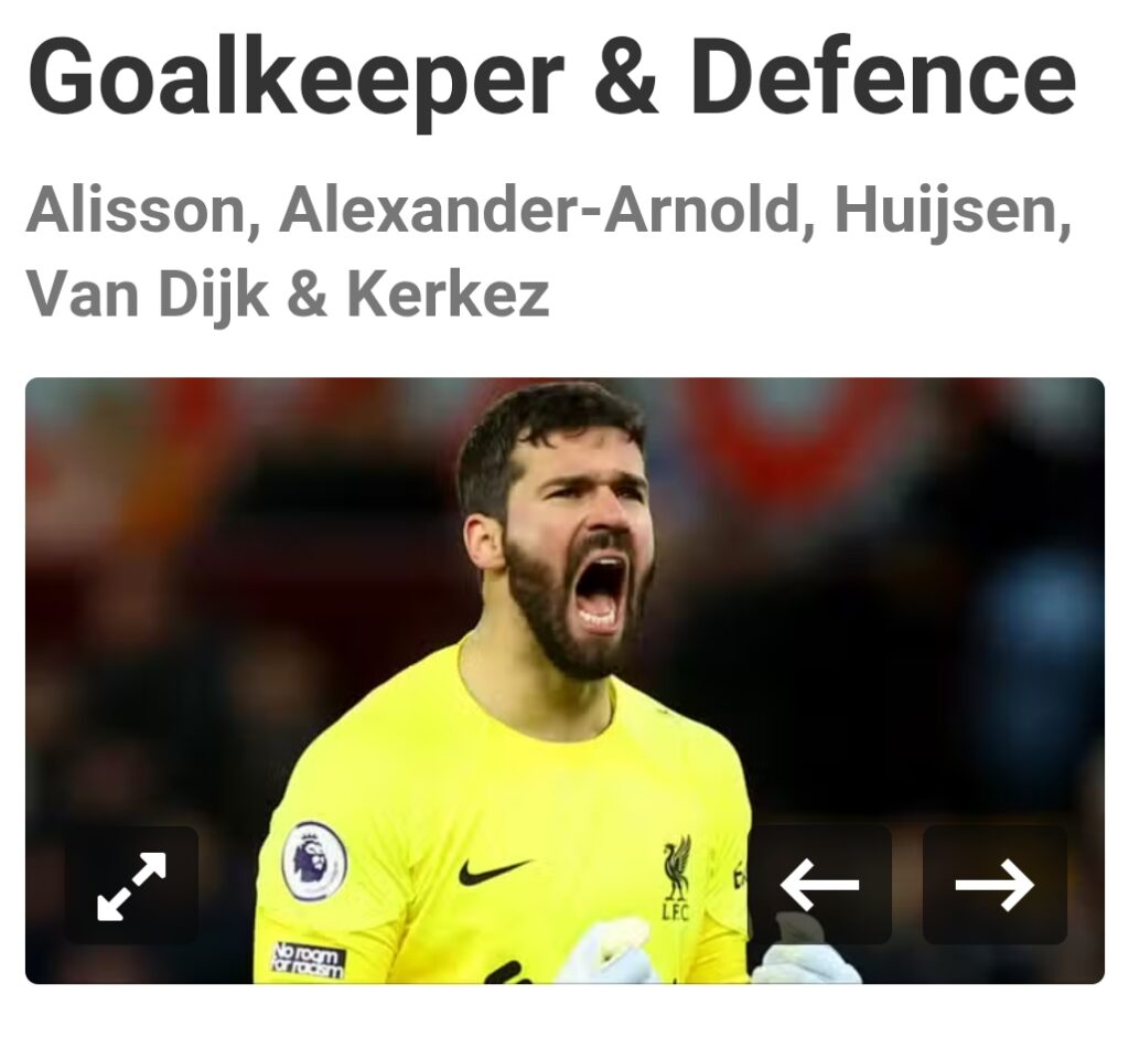 The Brazilian has been fantastic following his move from AS Roma in 2018 and he’s still one of the best keepers on the planet.Next, they’d have Trent Alexander-Arnold in the team by the time the next season starts.