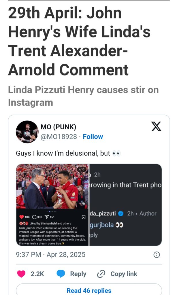 And now Linda Pizzuti Henry, the wife of Liverpool owner John W. Henry, has set tongues wagging after replying with an eyes emoji when one fan noted that she’d posted a photo of her husband and Trent together.