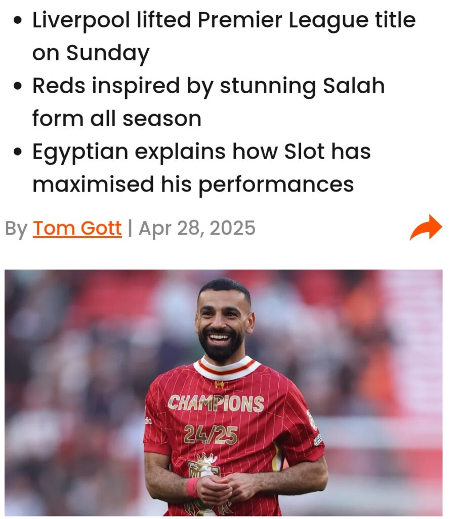 “With the Premier League title now wrapped up, Salah’s individual focus will turn to breaking the Premier League’s single-season assist record, currently held jointly by Thierry Henry and Kevin De Bruyne at 20.