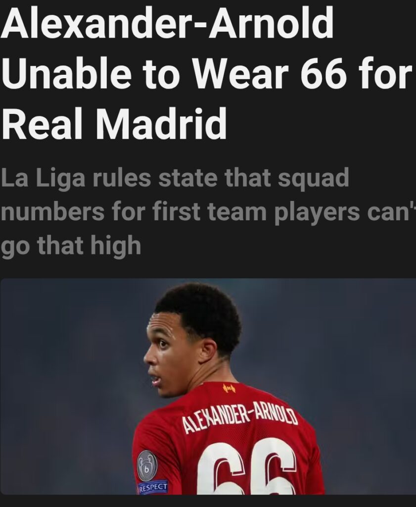 Trent Alexander-Arnold will be prohibited from wearing the number 66 upon his transfer to Real Madrid this summer, due to a lesser-known regulation in La Liga. The Liverpool defender has announced that he will conclude his 20-year affiliation with his childhood club at the season’s end, allowing him to join Real Madrid as a free agent. Having progressed through the academy at Merseyside, Alexander-Arnold has retained the same squad number assigned to him when he first entered the senior team, despite having worn numbers 2, 7, 8, and even 10 at the international level. Consequently, he may need to adopt one of those numbers at the club level, as 66 is set to be retired.