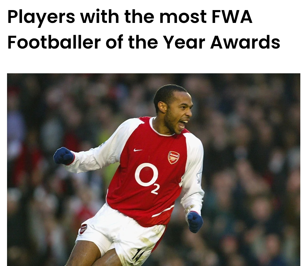 PlayerWins (Years)Thierry Henry3 (2002/03, 2003/04, 2005/06)Mohamed Salah3 (2017/18, 2021/22, 2024/25)Stanley Matthews2 (1947/48, 1962/63)Tom Finney2 (1953/54, 1956/57)Danny Blanchflower2 (1957/58, 1960/61)Kenny Dalglish2 (1978/79, 1982/83)John Barnes2 (1987/88, 1989/90)Gary Lineker2 (1985/86, 1991/92)Cristiano Ronaldo2 (2006/07, 2007/08)Matthews is one of seven players to have been individually recognised by the FWA on two separate occasions, yet only Henry had been granted the privilege of three titles before Salah’s sensational year.