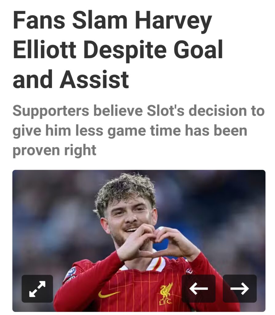 “A fifth stated: “Elliott goal and assist and he’s probably convinced Slot to sell him,” with a sixth saying: “Harvey Elliott’s performance is like watching a young lad that won a competition to play in one of Liverpool’s remaining fixtures…he’s out of place here,” and a seventh concluding: “For all his talent and guile, Harvey Elliott is such a frustrating player, always finds an excuse to play the ball backwards.”