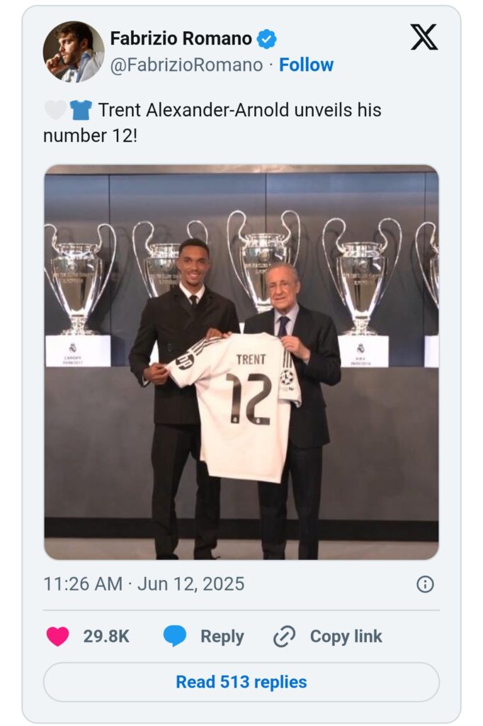 Alexander-Arnold has proudly worn the number 66 jersey throughout his time at Liverpool, but with his move to Real Madrid, he’ll be switching to the number 12 due to La Liga regulations.