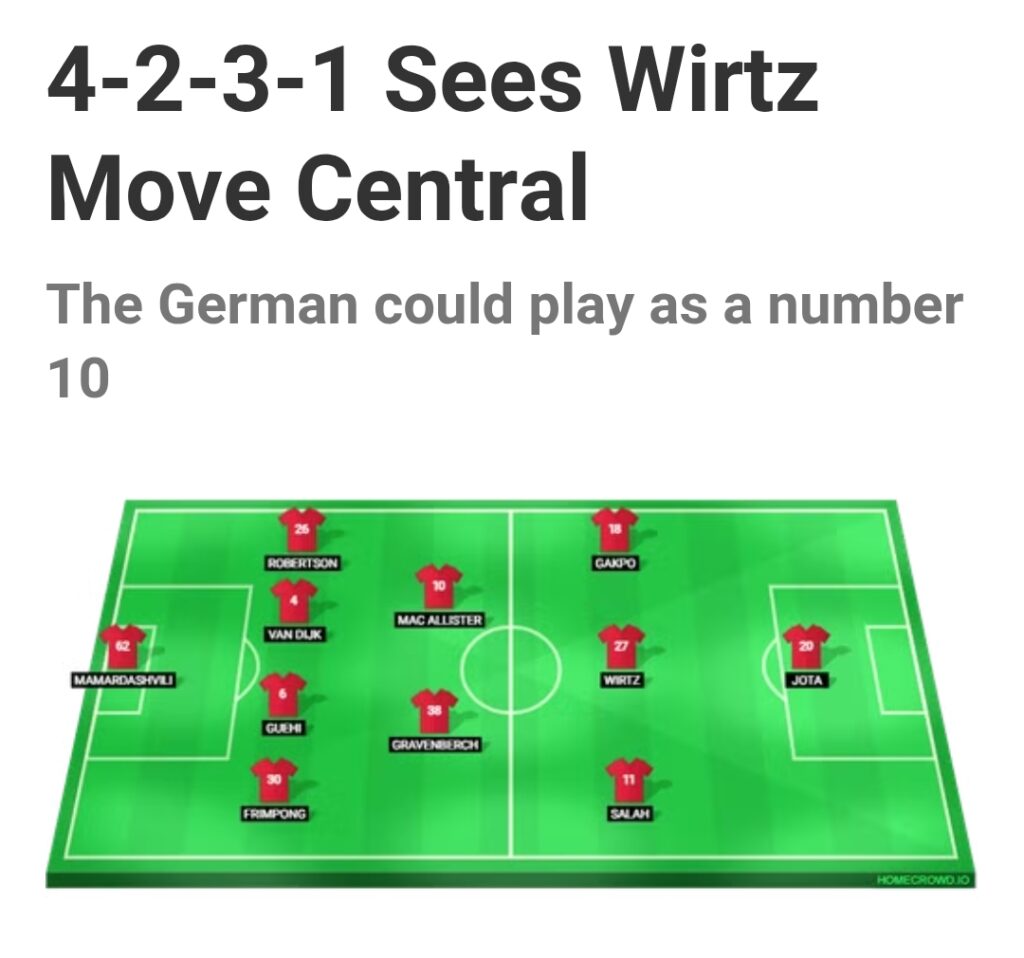 Wirtz would occupy a position in the front three, specifically on the left, while Mohamed Salah would undoubtedly retain his position on the right, serving as the primary goal-scoring threat.