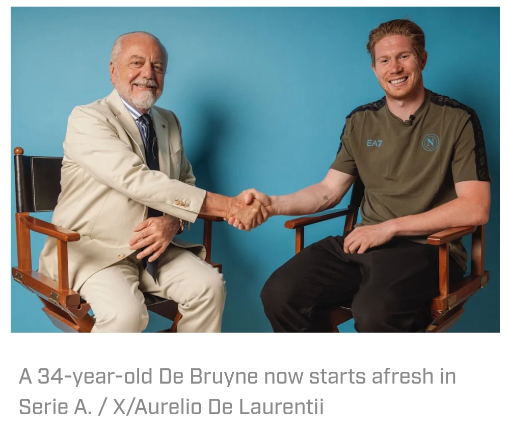 De Bruyne chose to sign with Serie A champions Napoli earlier this month, moving his family to the Amalfi Coast in Italy, and committing to an initial two-year contract until 2027.