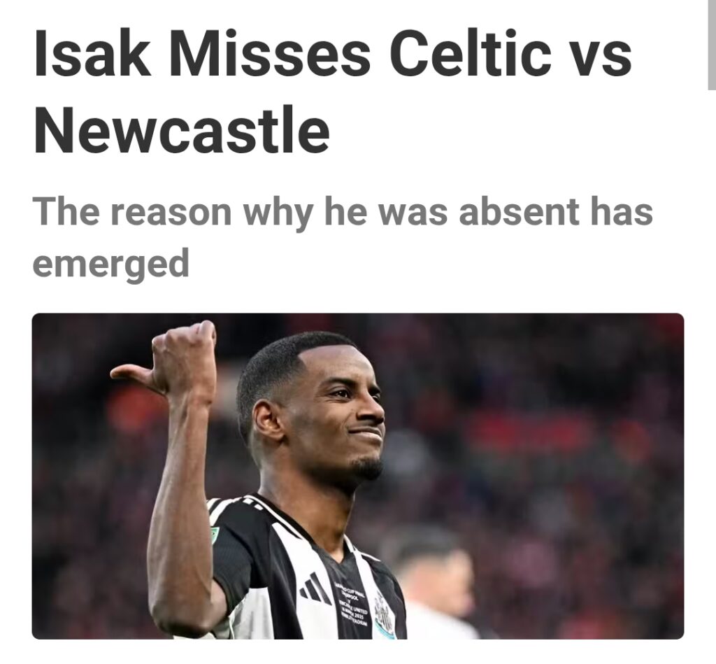 Newcastle participated in pre-season activities on Saturday afternoon as they made their way to Scotland to compete against Celtic. Isak was anticipated to play, but he was unexpectedly left off the teamsheet.